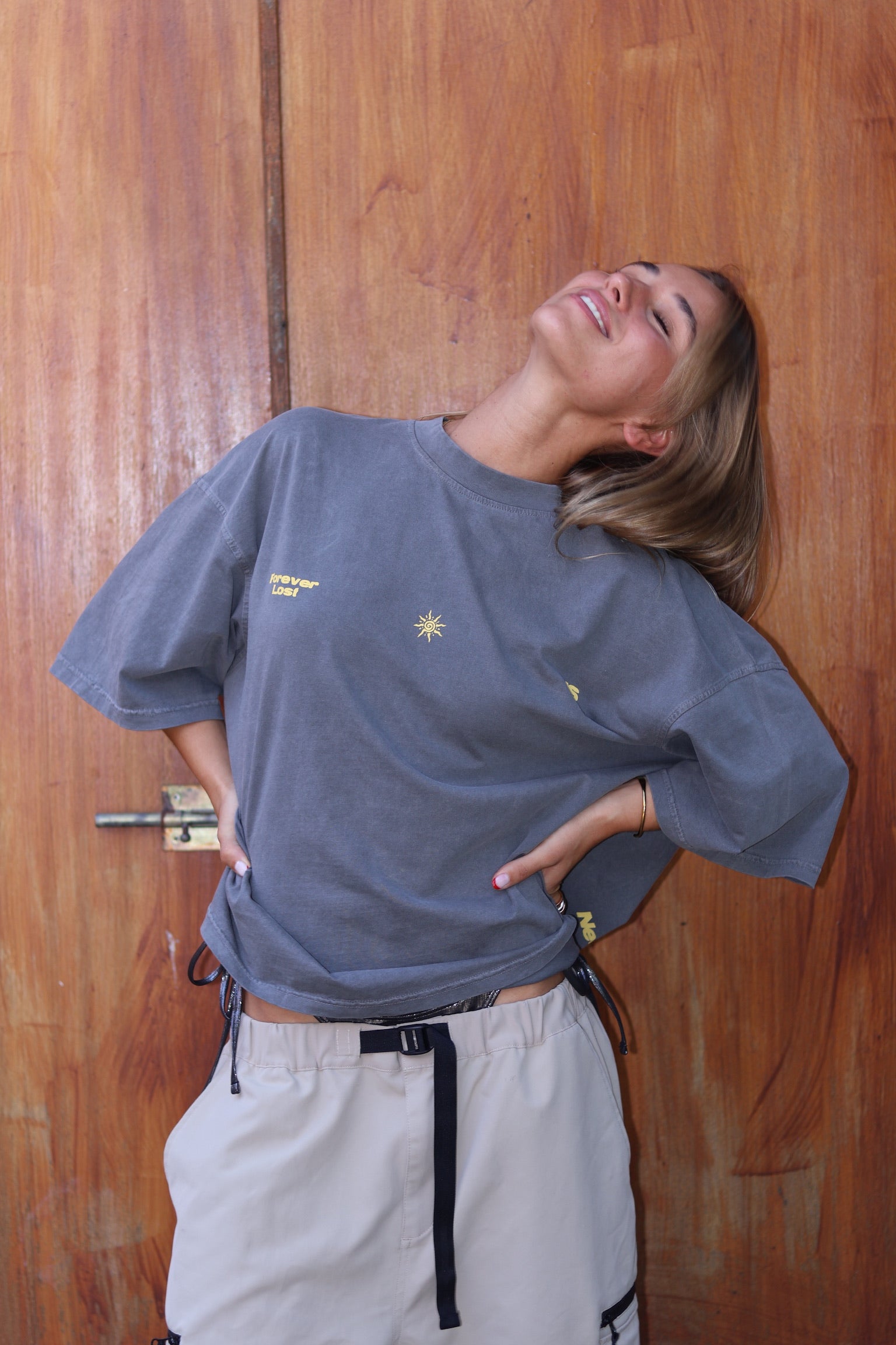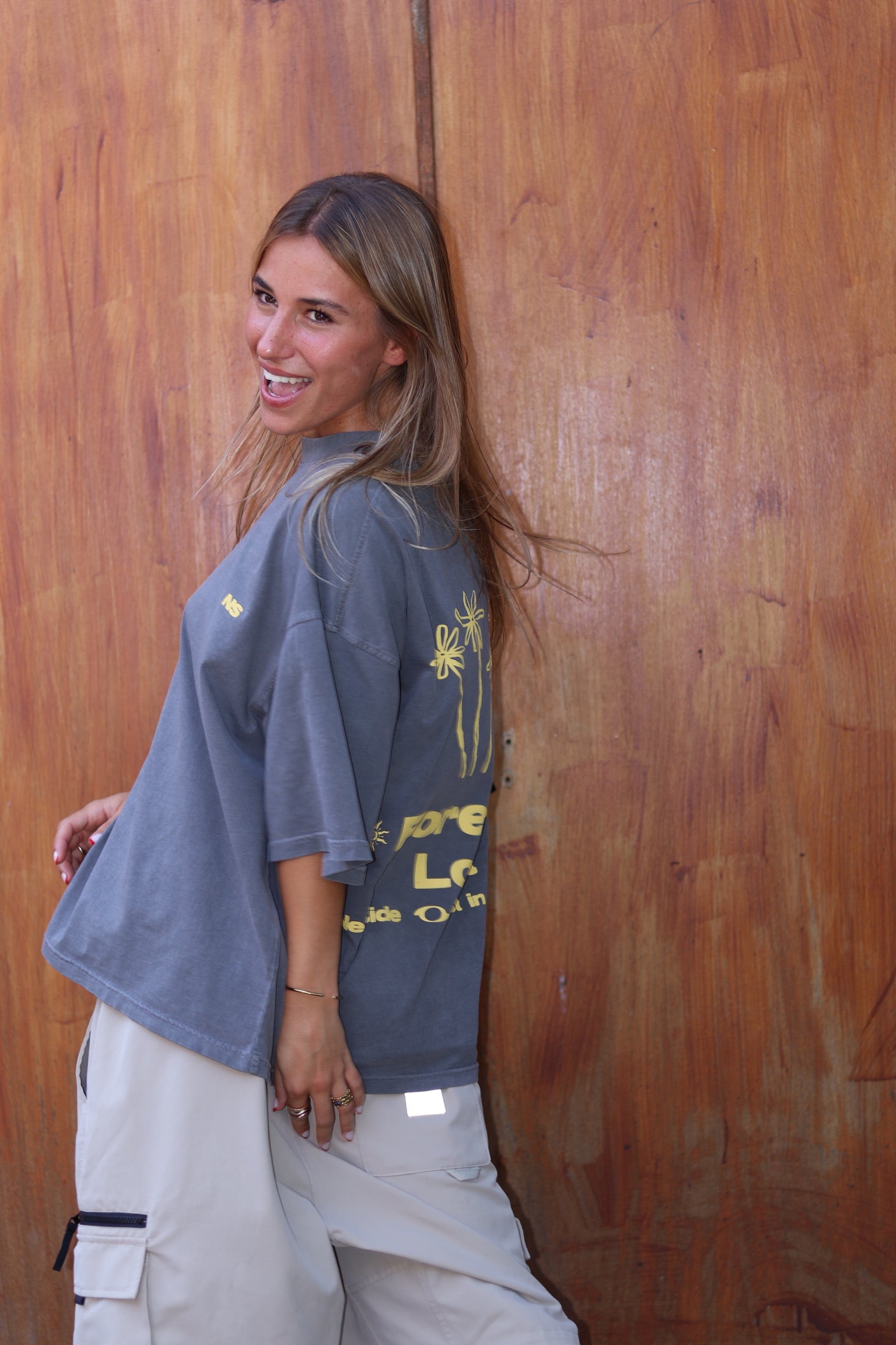 Camiseta oversize en tono gris desgastado, confeccionada en 100% algodón (200 GSM) para un tacto suave y un ajuste relajado de alta calidad.