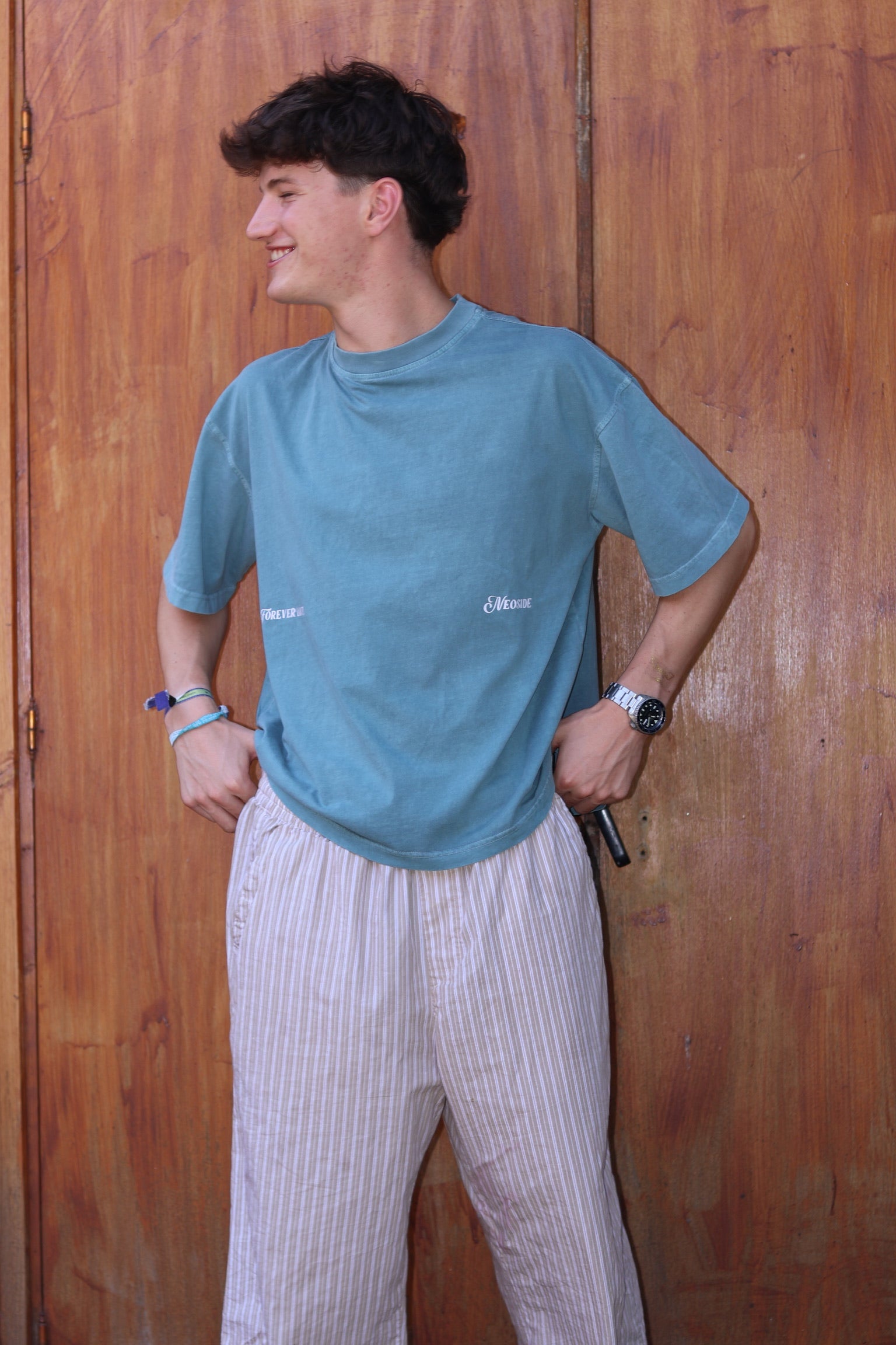 Camiseta oversize en tono azul lavado, confeccionada en 100% algodón (200 GSM) para un ajuste cómodo y de alta calidad.